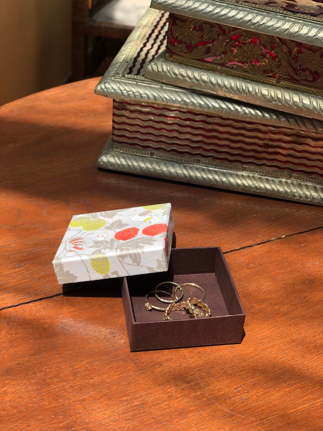京都の老舗紙器メーカーによる世界初の箱店 BOX&NEEDLEとオチビの夢のコラボ 大切なものや、プレゼントを仕舞う『箱』 今、この『箱』そのものを好きなように楽しむ、という人達が増えてきています。 そんな中、京都の老舗紙器メーカーが出店したBOX&NEEDLE。手作りの箱だけを売っている、世界初の箱店です。 その上のこだわりも一徹。イタリア、イギリス、フランス、フィンランド、インド、ネパールなどの世界中から選び集めた紙を職人の手で一点一点手貼りで制作。“暮らしを彩る紙器”に、オチビサンが遊びます。 四角い小箱は手のひらサイズの正方形のボックス。 小さいアクセサリーがをしまうのにぴったり。 いちご柄に、チョコレート色組み合わせが美味しそうな小箱です。 サイズ:W60×D60×H20mm [使用例] ・おまけのプチギフトに喜ばれます。中にキャンディやミニカードを入れて小さなプレゼントボックスにしても。 ・髪留めやピアス、ブローチなど小分け収納に活躍します。引き出しの中やドレッサー周りにおいて。旅行の際にそのまま鞄に入れてもっていくことも。 ・切手やシールなど趣味の小物の収納