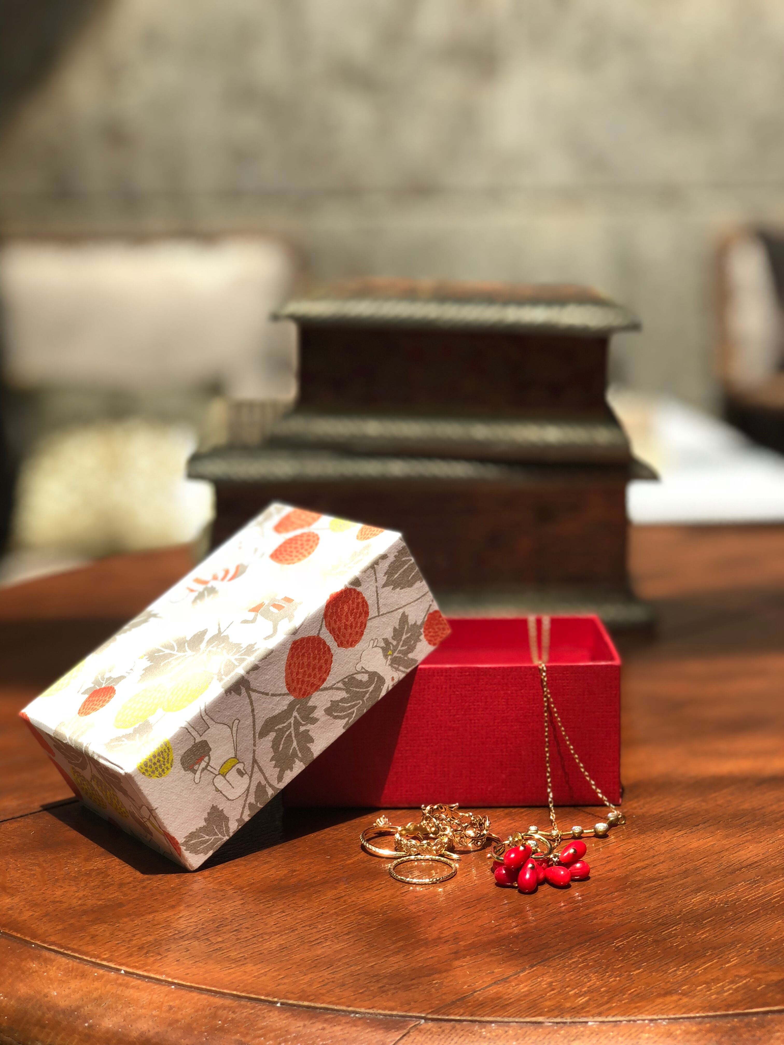 その上のこだわりも一徹。イタリア、イギリス、フランス、フィンランド、インド、ネパールなどの世界中から選び集めた紙を職人の手で一点一点手貼りで制作。“暮らしを彩る紙器”に、オチビサンが遊びます。