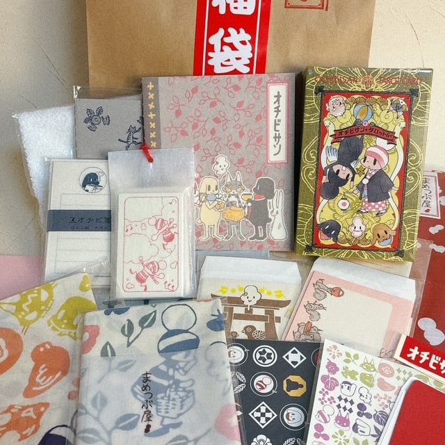 まめつぶ屋特製てぬぐいやあずま袋に加え、お正月に使えるポチ袋セットや、オチビの季節のノートやポストカード、タロットカードなど定価総計税込13000円以上を詰め合わせて、新春特価の税込3300円(送料別)でご用意しました。